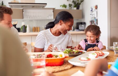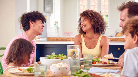 Parents With Adult Offspring Sitting Around Table At Home Enjoying Meal Together