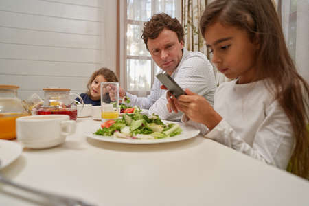 Close up of dinner table full of healthy dishes. Father sitting next to daughter and showing her how to use knife and fork. They are having salad with vegetables
