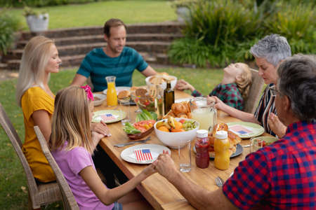 Caucasian three generation family holding hands saying grace before eating meal together in garden. three generation family celebrating independence day eating outdoors together.