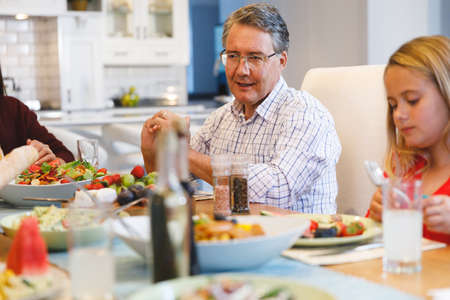 Caucasian grandfather and granddaughter sitting at table and having family dinner. family spending time together at home.