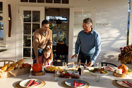 Image of multi generation caucasian family preparing dinner together. Family and spending quality time together concept.