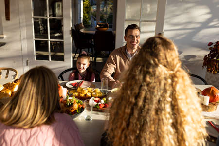 Smiling african american mid adult man having lunch with family at home on thanksgiving day. unaltered, family, food, togetherness, cultures and holiday concept.