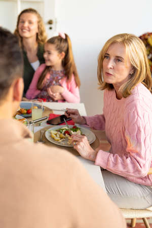 Vertical image of happy extended caucasian family eating dinner together. Family and spending quality time together concept.