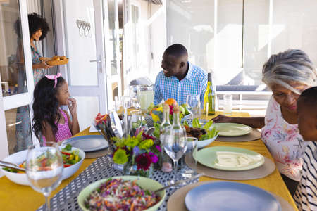 Image of happy multi generation african american family eating breakfast together. Family and spending quality time together concept.