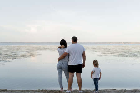Back view on happy husband cuddling his wife with their daughter enjoying the sunset on the lake. Family portrait concept, happiness