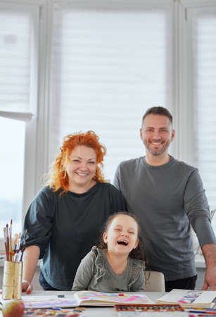 Leisure weekend activity at home - drawing together. Smiling people happy together during quarantine. Beautiful laughing caucasian family: dad, mom and cute little girl