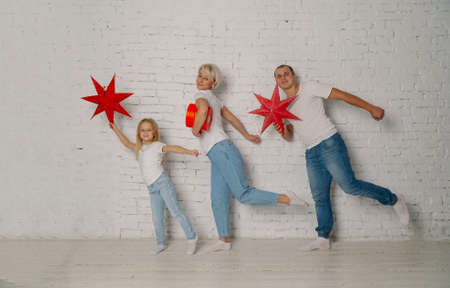 Three people Caucasian family with dad, mom and daughter portrait, grey background, looking at camera