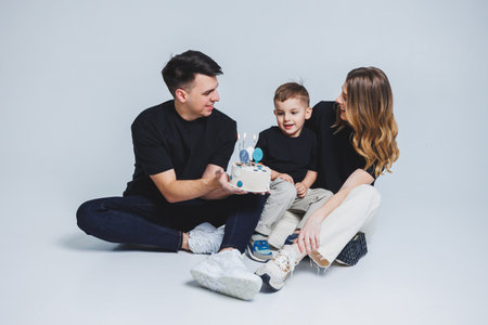 Happy family couple celebrating their son's birthday on a white background. mom dad and son with cake