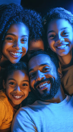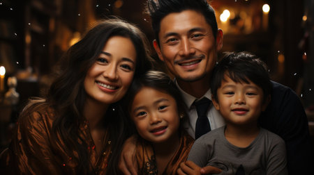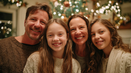 A joyful family smiles for the camera during the Christmas holidays, surrounded by a beautifully decorated tree, radiating warmth and togetherness.