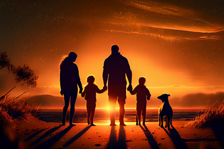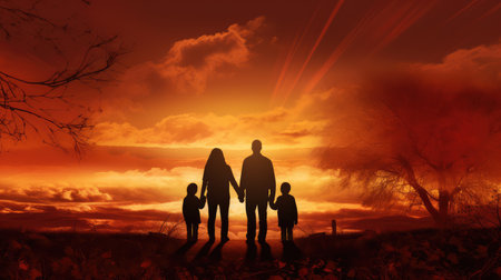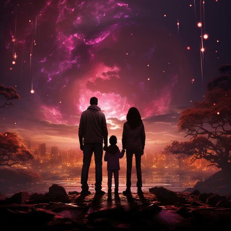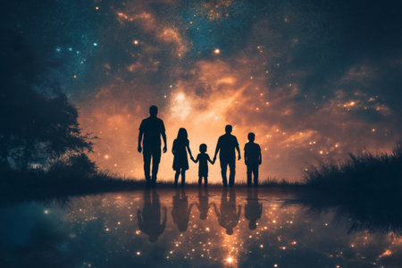 family stands together under starry night sky, holding hands and gazing at Milky Way. silhouette captures moment of connection and wonder in natures beauty.