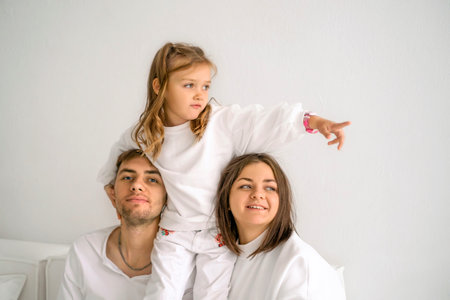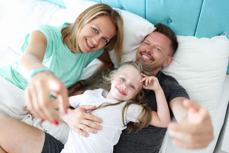 Little child girl vith your paren lie on bed portrait. Wife husband and daughter in hotel room. In vitro fertilization planing.
