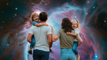Happy family adventure in cosmic galaxy background with smiling parents and kids.