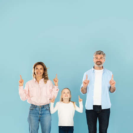 Joyful Family Of Three Pointing Fingers Up Over Blue Background