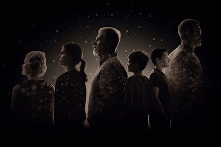Different generations of family stand together against dark abstract background. Genealogical history of generations, preservation of the memory of relatives. Created with Generative AI