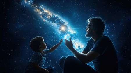 A man and a child are looking up at the stars. The man is holding the child's hand
