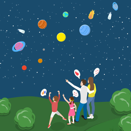 3D Isometric Flat Vector Illustration of Happy Family, Gazing At Twinkling Night Sky While Intertwined.
