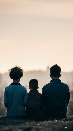 Three children sitting together, gazing at a serene sunset, embodying friendship and the beauty of shared moments.