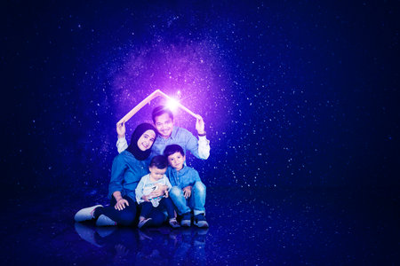Muslim family holding a house roof symbol from cardboard over their heads while sitting together in the cyberspace with milky way background
