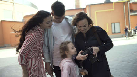 Female and couple with a cute little girl viewing pictures on the camera. Action. Photographer showing shots to the happy young family outdoors on a summer day.