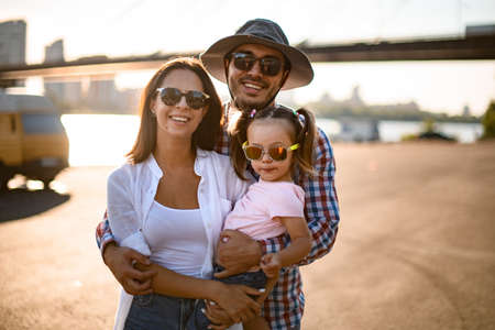 family portrait of mother and father and little cute daughter in sunglasses
