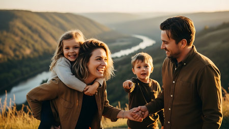 Family enjoys outdoor adventure during sunset in mountain area