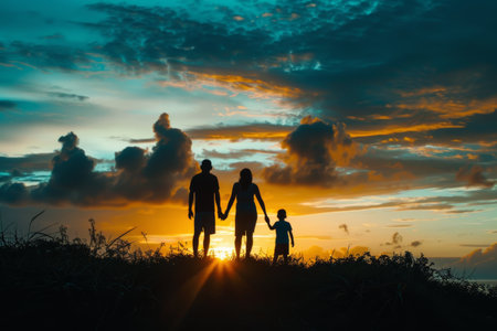 Silhouettes of a family on a trip, bonding under sunset.