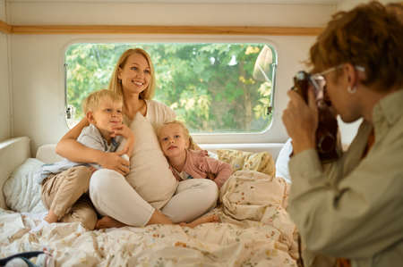 Mother with children poses in motorhome, camping