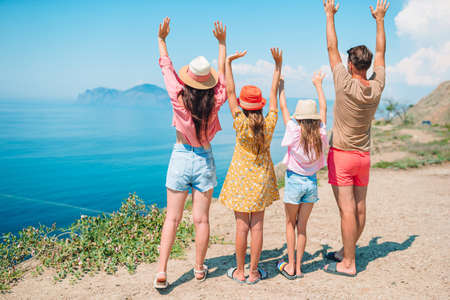 happy family of four people looking to beautiful seascape in mountains. family concept