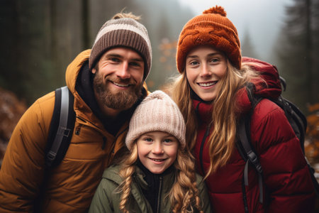 A family of three, warmly dressed in winter hats and jackets, smile together on a foggy forest trail.