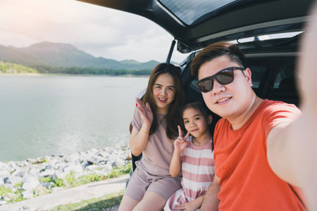 Summer break Happy family having fun while taking a selfie camera. The concept of family on vacation and travel.