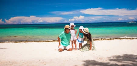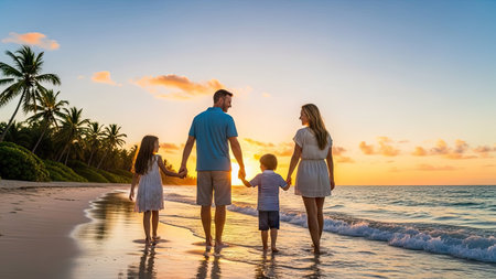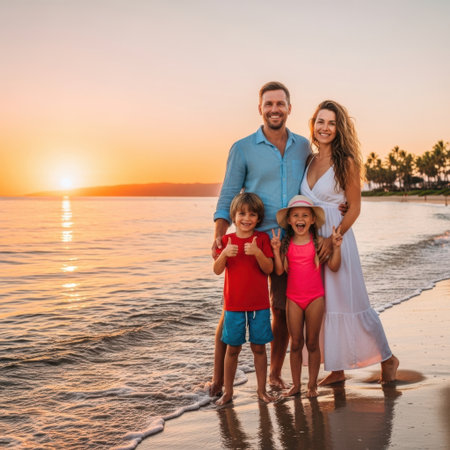 A joyful family of four stands on a sandy beach at sunset. The parents are smiling broadly, with the father wearing a blue shirt and the mother in a white dress. Their two children, dressed in colorful swimwear, are excitedly posing with the ocean and palm trees in the background.