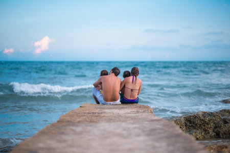 Happy family sitting on the beach and looking at the sea. Family travel concept
