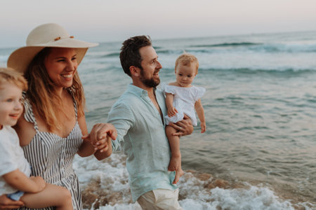 A family with two toddler children walking on beach on summer holiday at sunset.