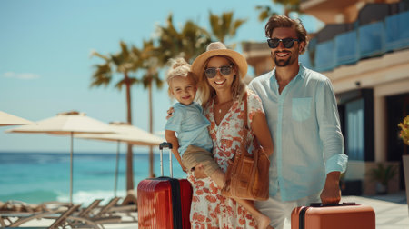 Family stands on beach with luggage, preparing for a summer getaway, enjoying the ocean breeze and the picturesque coastline during a sunny day