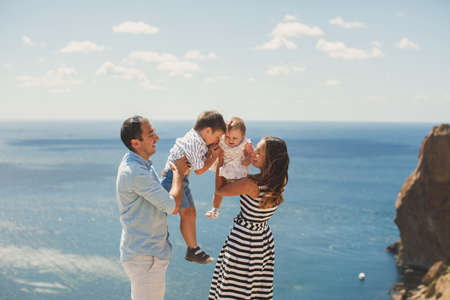 Happy family standing on the background of the sunset sky and sea holding hands. High quality photo