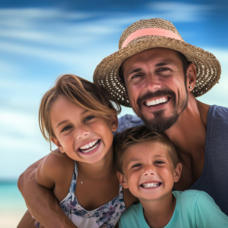 A man and two children are facing the camera, all smiling happily in a joyful moment.