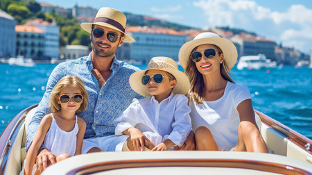 father, mother, child - wearing sunglasses, smiling at the camera while enjoying a sunny day on a boat. In the blurred background, a marina filled with yachts suggests a luxurious vacation setting