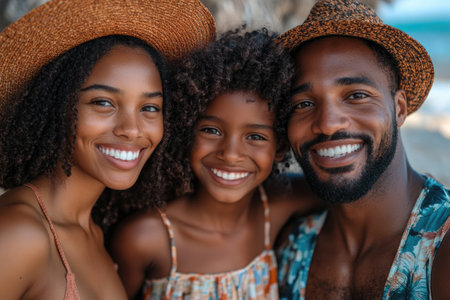 A joyful family of three, featuring a mother, father, and child, takes a close-up selfie at the beach on a sunny day, capturing their bright smiles and a moment filled with happiness and love.