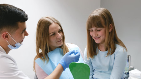 Girl, smile and dentist for consultation with discussion, oral hygiene and mouth cleaning service. Mother, health professional and orthodontic inspection for dental care with child for checkup