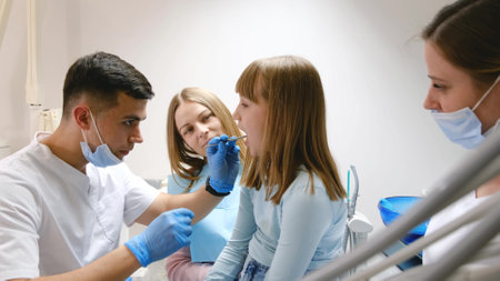 A dentist and his assistants examine the oral cavity of a red-haired teenage girl. assistants