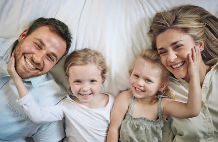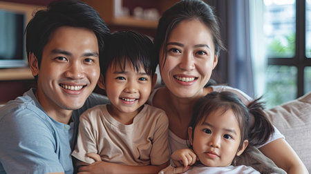 A heartwarming family portrait captures a joyful moment with a smiling couple and their two adorable daughters. The image radiates warmth and love, showcasing the close bond and happiness shared among family members in a cozy, inviting setting