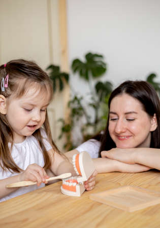 Montessori material. Mom teaches her daughter how to brush her teeth while playing. home education concept. child toddler girl