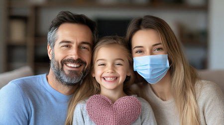 A family portrait featuring a father, mother, and daughter. The mother is wearing a face mask. All are smiling.