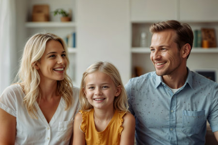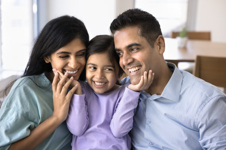 A happy family of three shares a warm embrace, with a little girl beaming joyfully between her smiling parents. The scene radiates love and happiness, showcasing the bond and connection within this beautiful family unit.