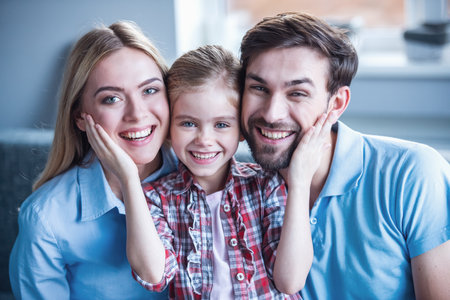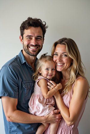 Caucasian family of three: a man, a woman and a young girl with blonde hair, The image exudes warmth and happiness.