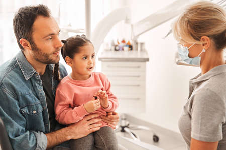 Visiting the dentist with children. A little girl is sitting in a dental clinic with her mother