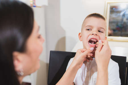 Kids stomatology and teeth care concept. Dentist checking little child patient teeth up at dental clinic. Close-up of little boy opening his mouth wide during inspection of oral cavity.