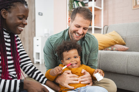 Happy mixed race parents and their two children brushing their teeth together at home. Young couple teaching their kids good hygiene habits. Family of four with little girl and boy getting ready together.