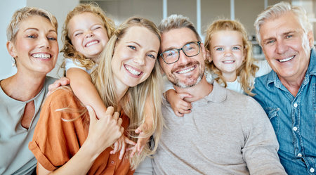 Bonding, big family and portrait in lounge, grandparents and happy with love for daughter, girls and hug. Home, kids and mom in living room, woman and man with child, smile and embrace for care