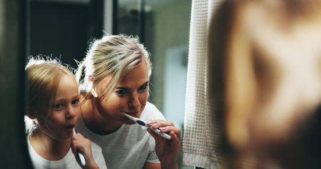 Mother, child and brushing teeth with mirror in bathroom for morning routine or cleaning mouth at home. Mom, daughter or kid with toothbrush for fresh breath, dental hygiene or oral care at house